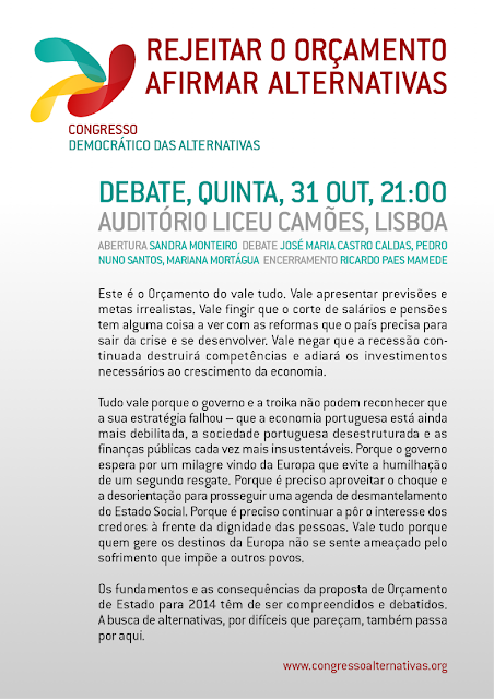 O Congresso Democrático das Alternativas apresenta nesta quinta-feira, 31 de Outubro, às 21h no auditório do Liceu Camões (Lisboa), o debate: “Rejeitar o orçamento, Afirmar alternativas”. A abertura será feita por Sandra Monteiro, seguindo-se o debate com José Maria Castro Caldas, Pedro Nuno Santos e Mariana Mortágua. O encerramento ficará a cargo de Ricardo Paes Mamede.